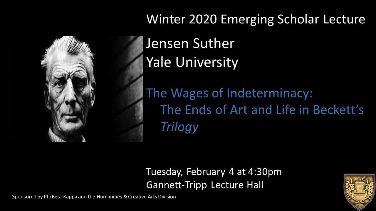 Elmira, NY (01/28/2020) — Jensen Suther, a Ph.D. candidate at Yale University, will present the upcoming Emerging Scholar Lecture, titled "The Wages of Indeterminacy: The Wages of Art and Life in Beckett's Trilogy."